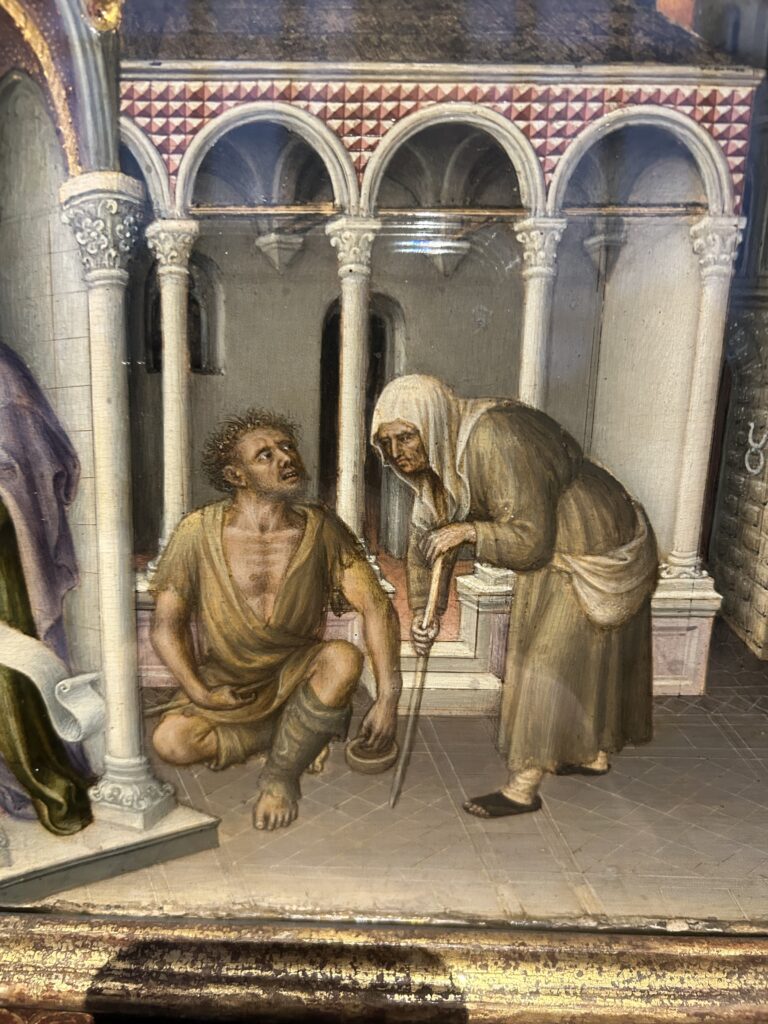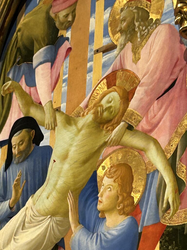 La mente va inevitabilmente anche al Trecento padovano, anticipatore delle innovazioni prodotte dall’Angelico. Già Giotto e il ciclo della Cappella degli Scrovegni, Padova era diventata il luogo in cui la pittura occidentale acquistò una grammatica nuova per chiarezza narrativa e novità nella raffigurazione dei corpi. Anche Altichiero da Zevio aveva introdotto una monumentalità drammatica e una tensione narrativa di grande modernità, mentre Giusto de’ Menabuoi, nel Battistero del Duomo di Padova, costruì uno degli universi figurativi più complessi e teologicamente ambiziosi del Medioevo europeo. In questa linea padovana – colta, teologica, profondamente consapevole del valore simbolico dell’immagine – il naturalismo non è mai fine a sé stesso. Serve a rendere credibile il racconto, ma non cancella mai la dimensione del sacro. L’oro, la frontalità, la costruzione gerarchica dello spazio convivono con la nuova attenzione al corpo e all’emozione.