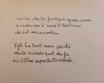 Intense tra noi le telefonate relative al concorso di poesia e, ad ogni quaderno pubblicato, mi rispondeva con una lettera nella quale evidenziava le poesie a lei più gradite, i disegni, partecipando così emotivamente ad ogni evento. Le telefonate però più frequenti avvennero quando, proprio sui gradini dell’amata Venezia, subì un incidente che la costrinse a casa per lungo tempo, ovviamente dimostrando tutta la sua insofferenza per questa situazione per lei inusitata. Penso che il telefono sia stato una provvidenza: si parlava di tutto, specialmente di attività relative alla poesia di Andrea, ai progetti sulla sua casa e sui suoi luoghi. Lentamente, poi, il tempo diviene tiranno e, per un insieme di disagi, è stata costretta a vivere a Padova, a casa di Giovanni. Non rispondeva quasi più al telefono, forse soggetta alle leggi dell’età: mi informavo della situazione attraverso il figlio, senza invadere gli spazi di questa gloriosa donna, spazi che a seconda del mutare degli eventi possono restringersi oltre la nostra volontà. Mi rincuorava allora il pensiero delle tante poesie che Andrea Zanzotto, veramente ammaliato da lei, le aveva dedicato, e voglio ricordarne una che fa parte delle “Sere del dì di festa”. La descrive con un favolistico cappello, vestita di rosso, alla guida della sua Opel Corsa: oltre ad esaltarne l’immagine, il poeta approfondisce e interpreta il senso dell’attesa nel suo “deludere amato della sera”.